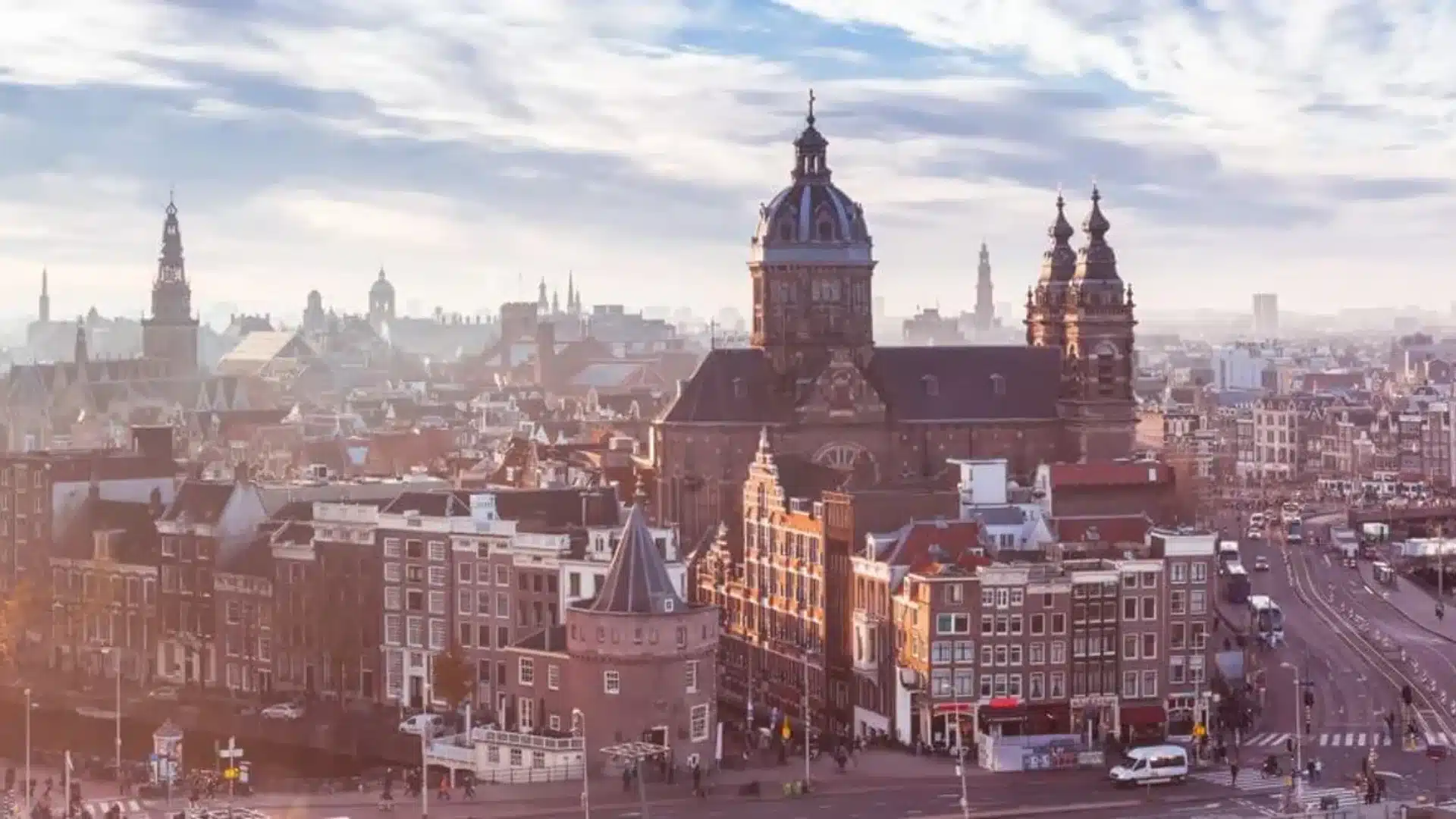 Amsterdam con la Basilica di San Nicola e i suoi dintorni con circolazione e persone che camminano