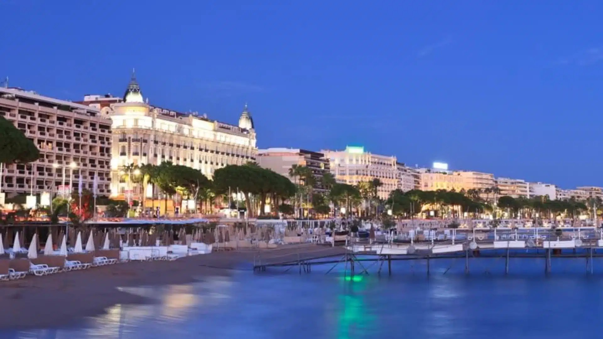 Prywatna plaża w Cannes nocą z oświetlonym pałacem Intercontinental Carlton na Croisette